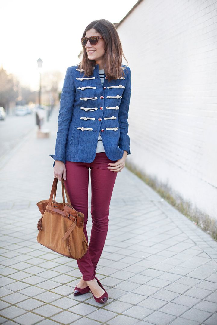 Y con las ganas que tenemos de primavera, en cuanto pude me lancé a la calle con la más marinera de todas y la combiné con un jersey marinero por encima por si quedaban dudas de mis ganas. ☺ Aprovechando los botones granates, la combiné con estos pantalones que sientan como un guante, queda mal que lo diga yo, pero es verdad que son muy gozosos, y recogen bien la pierna. Son de un tejido fino más propio de la primavera que del invierno. ¿Qué os parece el conjunto?